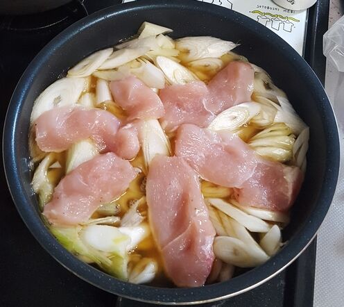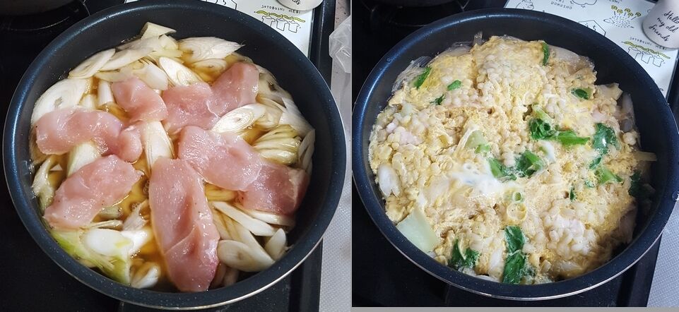 小土鍋に、カレー汁、春菊、油揚げ、ネギ、豚肉,卵などを加えましたよ~