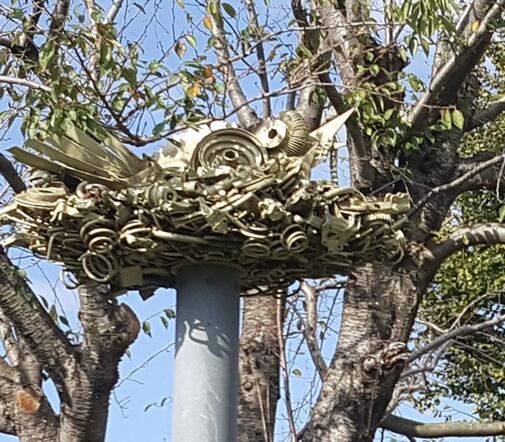タイヤのホイールやスプリング、プーリー、チェーンなどの車のパーツが所狭しと溶接されシルバーで塗装されていた