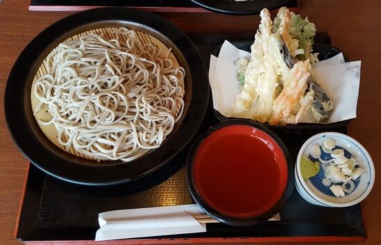 エビ天が二本とナス、にんじん、大葉・・・・等の野菜の天ぷらの盛り合わせと手打ちの盛りそばがセットだ