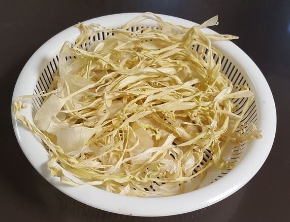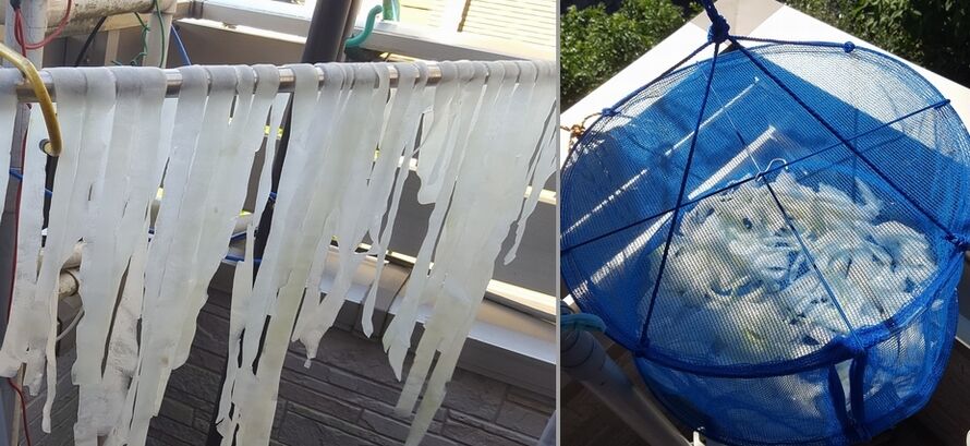 比較的長いのは左の写真のように竿などに伸ばして干し、短い物は干し篭に入れて乾燥させたのだ