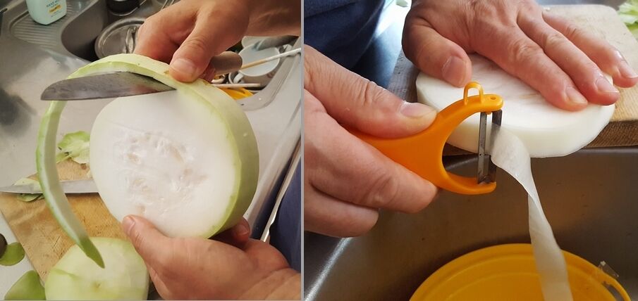 1~1.5cm幅に輪切りにしたかんぴょうの外皮をりんごを剥くような感じで落として、調理用のピラーでかんぴょう部分を押さえながら引いていく